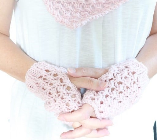 Keep your neck and hands cozy early fall or late summer with a lace knit cowl and lace knit fingerless mittens. The soft pink yarn is perfect for the lacy texture of the knitted cowl and knitted wrist warmers. You will receive two pdf files in this purchase, one per knitting pattern.