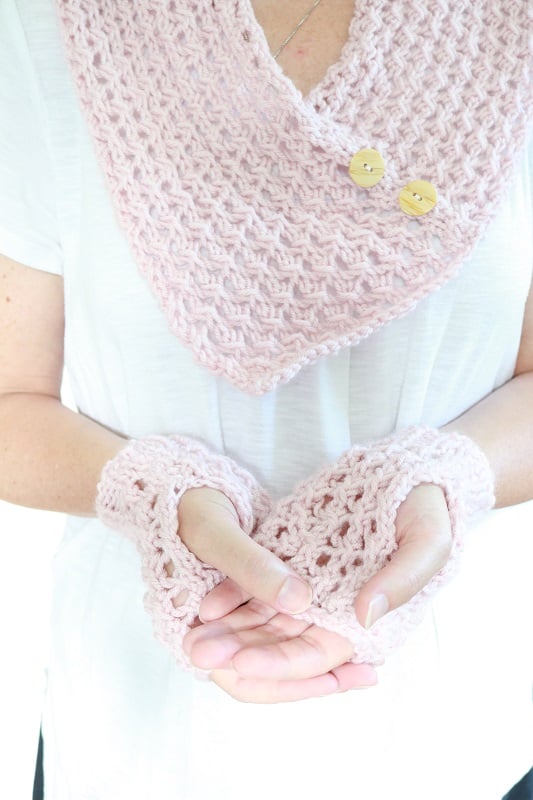 A lacy knit cowl & mitts pattern bundle is perfect for transitional seasons. The pretty & light cowl with buttons plus matching mitts add elegance to your handmade wardrobe.